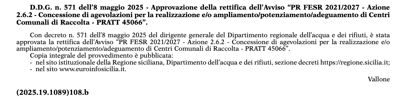 Con il bando PR FESR Sicilia 2021/2027 Azione 2.6.2 “Realizzazione e potenziamento di infrastrutture, attrezzature e mezzi per la gestione, la raccolta, il riuso ed il riciclo dei rifiuti e degli scarti di lavorazione” le SRR o direttamente i comuni hanno la possibilità di ricevere agevolazioni, nella misura del 100% dell’importo speso, per la realizzazione e/o ampliamento-potenziamento-adeguamento di Centri Comunali di Raccolta, per una dotazione complessiva di € 33.000.000,00.