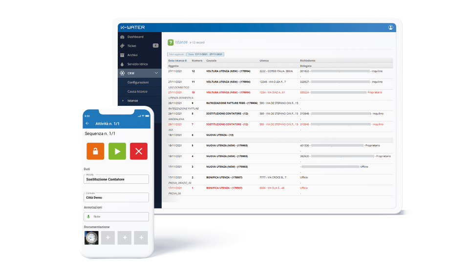 Gestione delle Istanze del Servizio Idrico Integrato con assegnazione automatica agli uffici di compe- tenza. Bacheca con le fasi di avanzamento delle istanze da lavorare, lavorate o chiuse. Dal Portale Web è possibile inviare sull’APP degli operatori le attività da svolgere sul territorio. Tramite l’APP viene gestito l’intervento con infor- mazioni georefenziate e documentazione fotogra- fica fino alla chiusura dell’attività con relativo esito. Invio notifiche all’utente sullo stato di avanzamen- to della richiesta effettuata. Per ogni fase viene generato un report con i tempi di evasione.