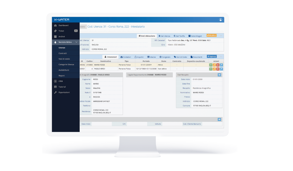 Gestione Utenze: storico proprietari; storico recapiti; storico contratti; storico unità immobiliari; storico inquilini; storico letture.